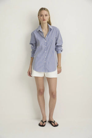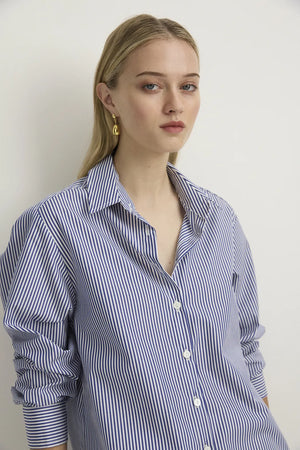 FIT: This shirt is a relaxed cut - not oversized. If you like an oversized look, you can easily go up a couple of sizes to achieve that look and feel. A classic borrowed-from-the-boys, but made-for-the-girls appeal, our Boyfriend shirt is refined and elevated everyday wear. A classic fit collar flows down to a button front with a curved shirt-tail-hemline. Yoke that flows just over the shoulders into a wide pleat in the centre back ensuring comfort and wear-with-ease. The shoulder seam is just off-the-shoulder point, and flows down into a relaxed fit sleeve with a button cuff to finish. Made from Italian milled dead-stock fabrication, this ensures their high quality of wear, and limited availability.