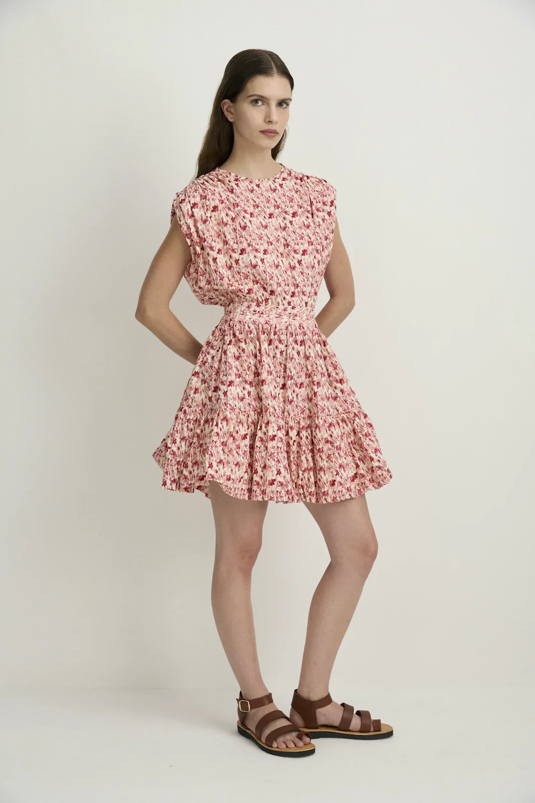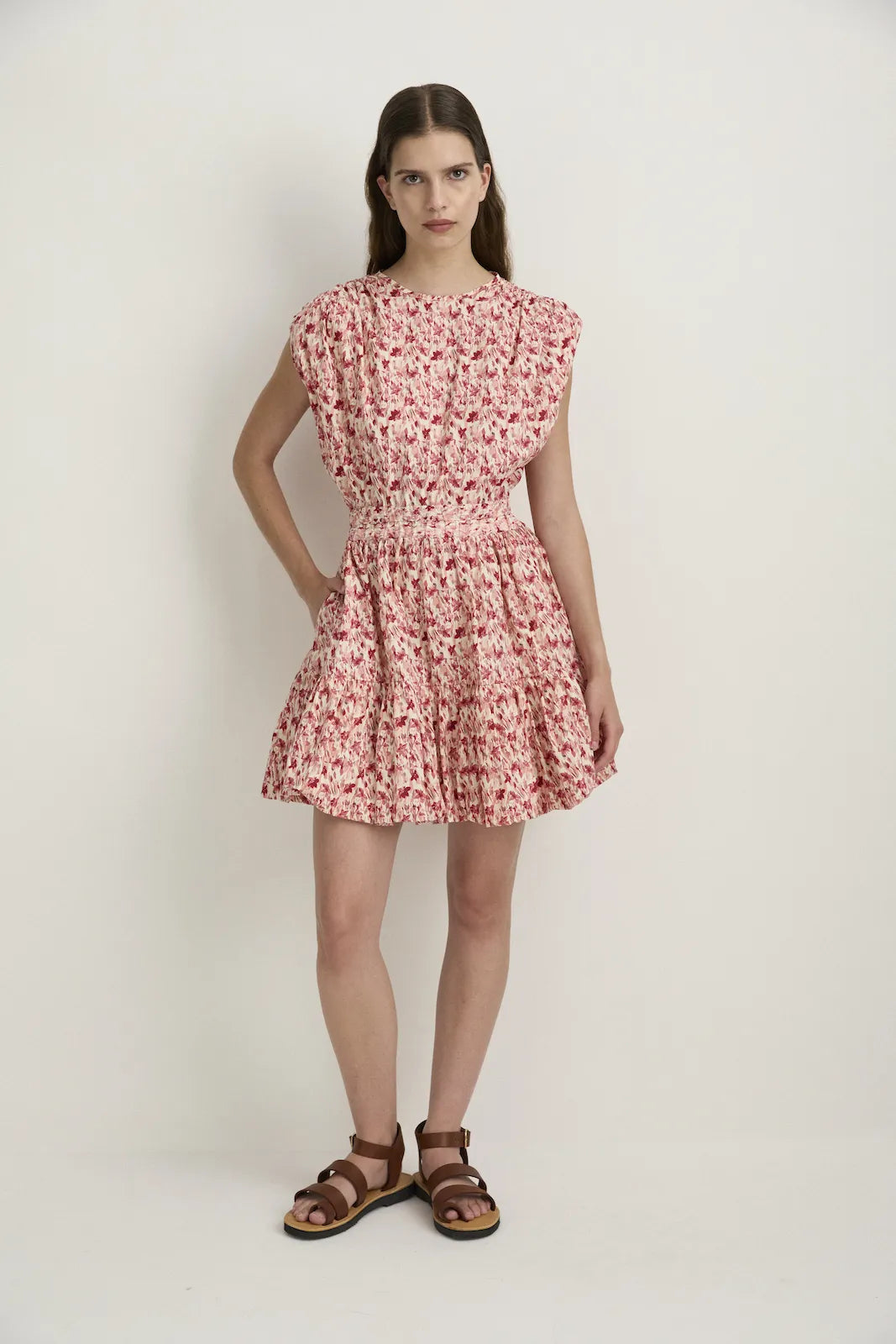 A simple round neckline is self-bound with a bias-bound split at the back of the neck and button closure to finish. Gathered shoulders extend past the shoulder point, the sleeve is tucked under itself to create a strong but feminine shoulder shape, the waist gathers into the two channels of soft elastic at the waist with a small eye-shaped opening at the back between the two rows of elastic, the skirt flows down to a bubble hem finish, with pockets built into the side seams. Falls above the knee.