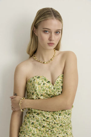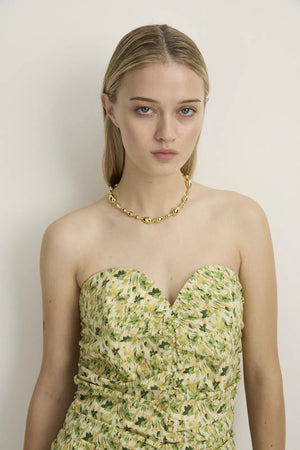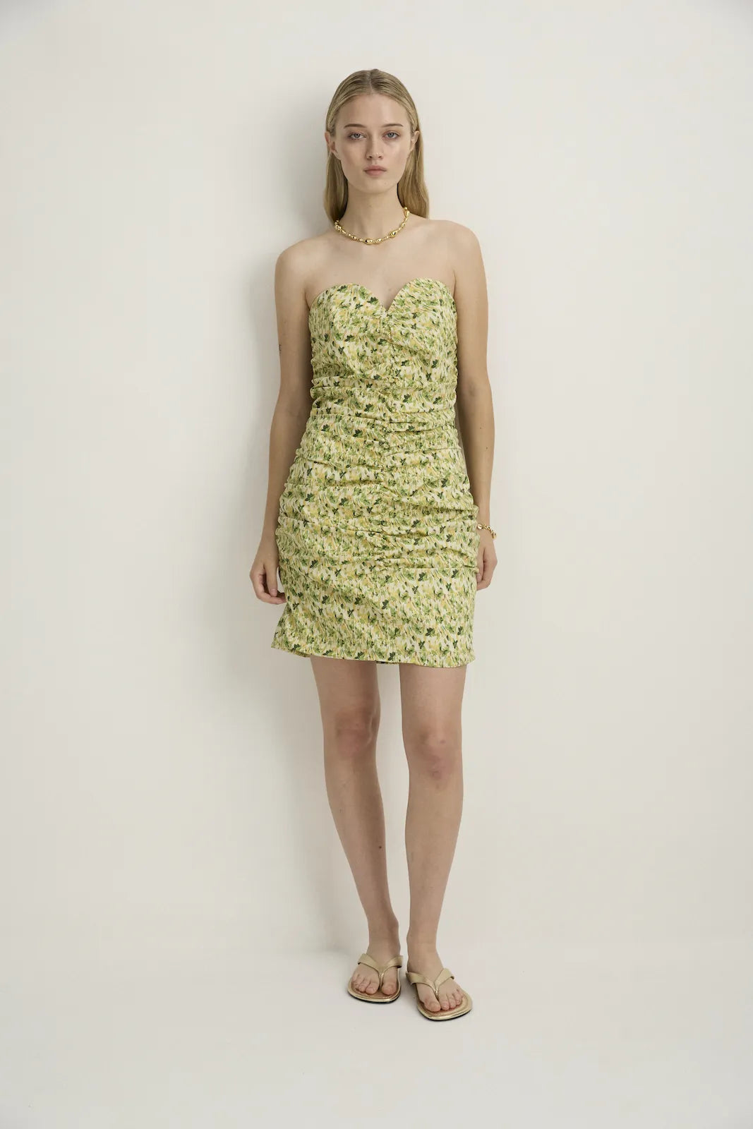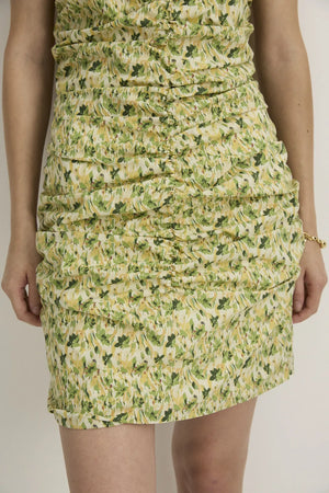 STYLE: A feminine summer essential bustier dress in a crisp gathered cotton, featuring our beautiful Green Bloomlight modern floral.