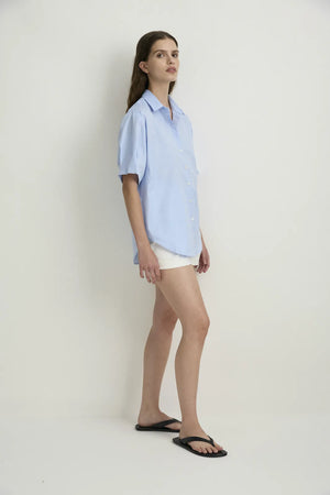 STYLE: A fresh short sleeved summer shirt style. Here in the freshest of sky blues in a fine herringbone weave.