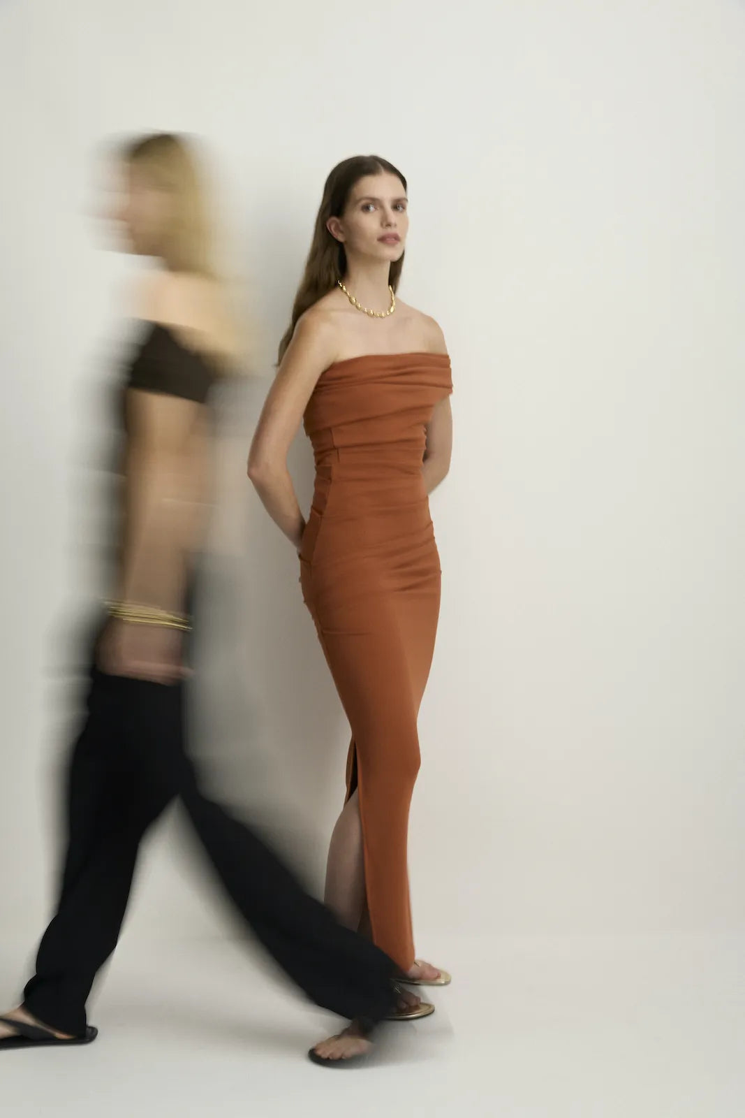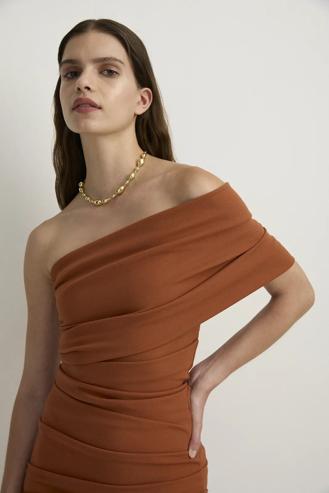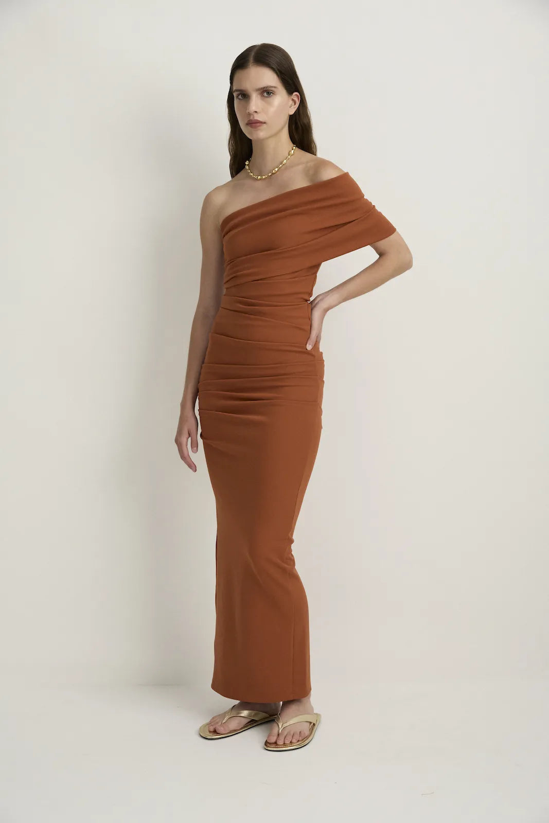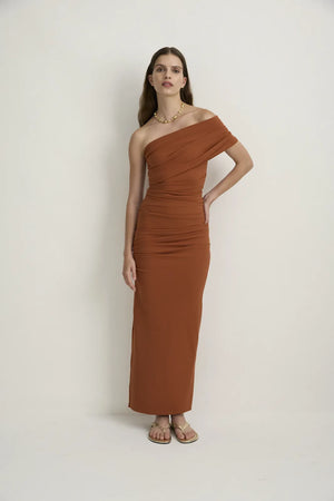 STYLE: A fresh and modern sculptured fitted maxi dress in a delightfully soft knitted fabrication that stretches and sculpts and holds - here in our warming terracotta colour we call Toffee